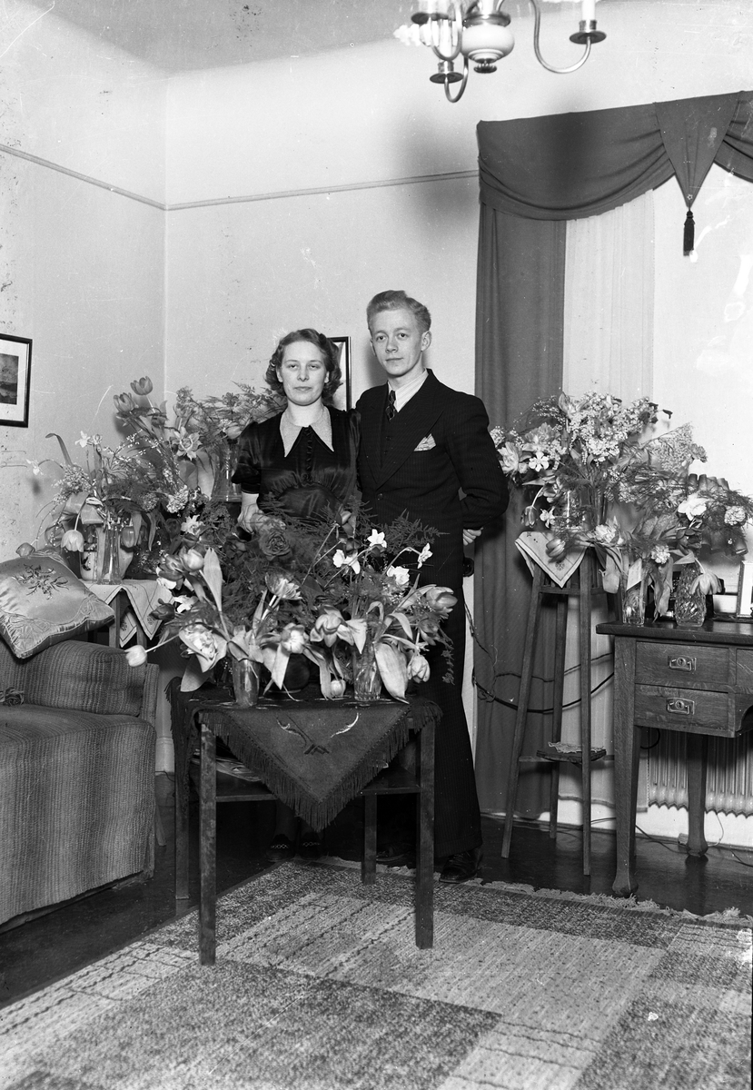 Foto av en kvinna och en man. De står omgivna av blommor, i ett vardagsrum.
