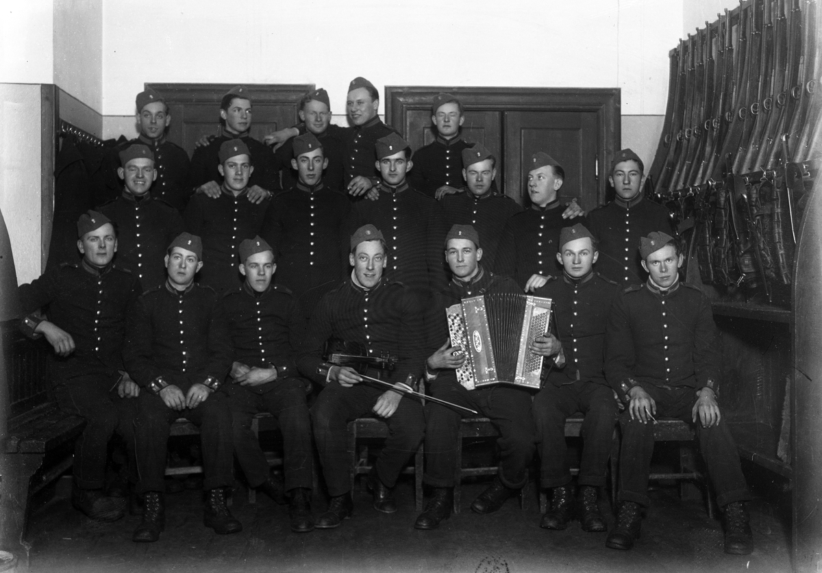 Titel: Foto av ett gäng "bassar", dvs meniga, i uniform. De är samlade i ett vapenrum på I 11, Växjö.