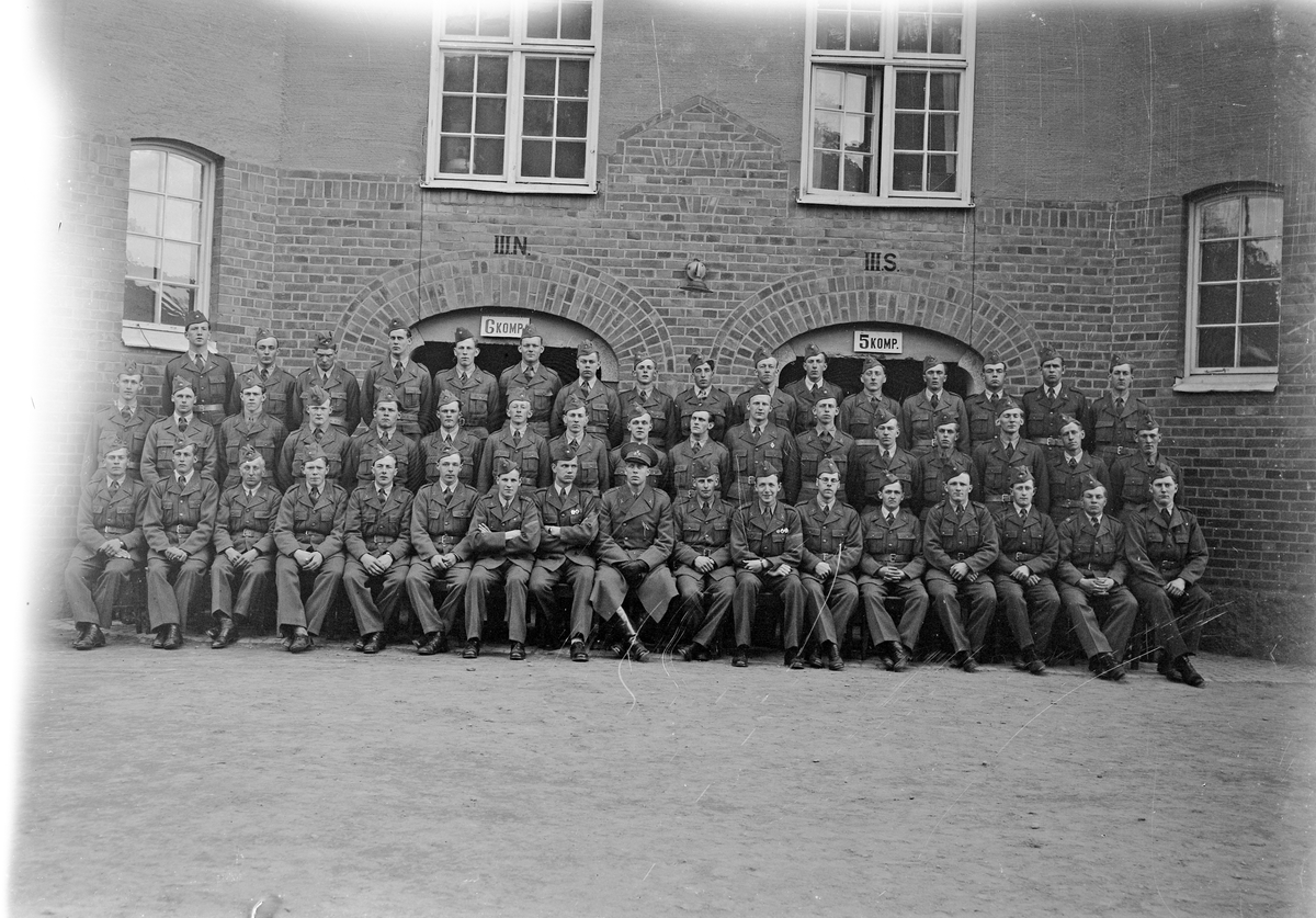Foto av en pluton meniga i uniform (m/39) framför en kasern (5:e kompaniet) på I 11, Växjö. I mitten av nedre raden syns deras befäl.