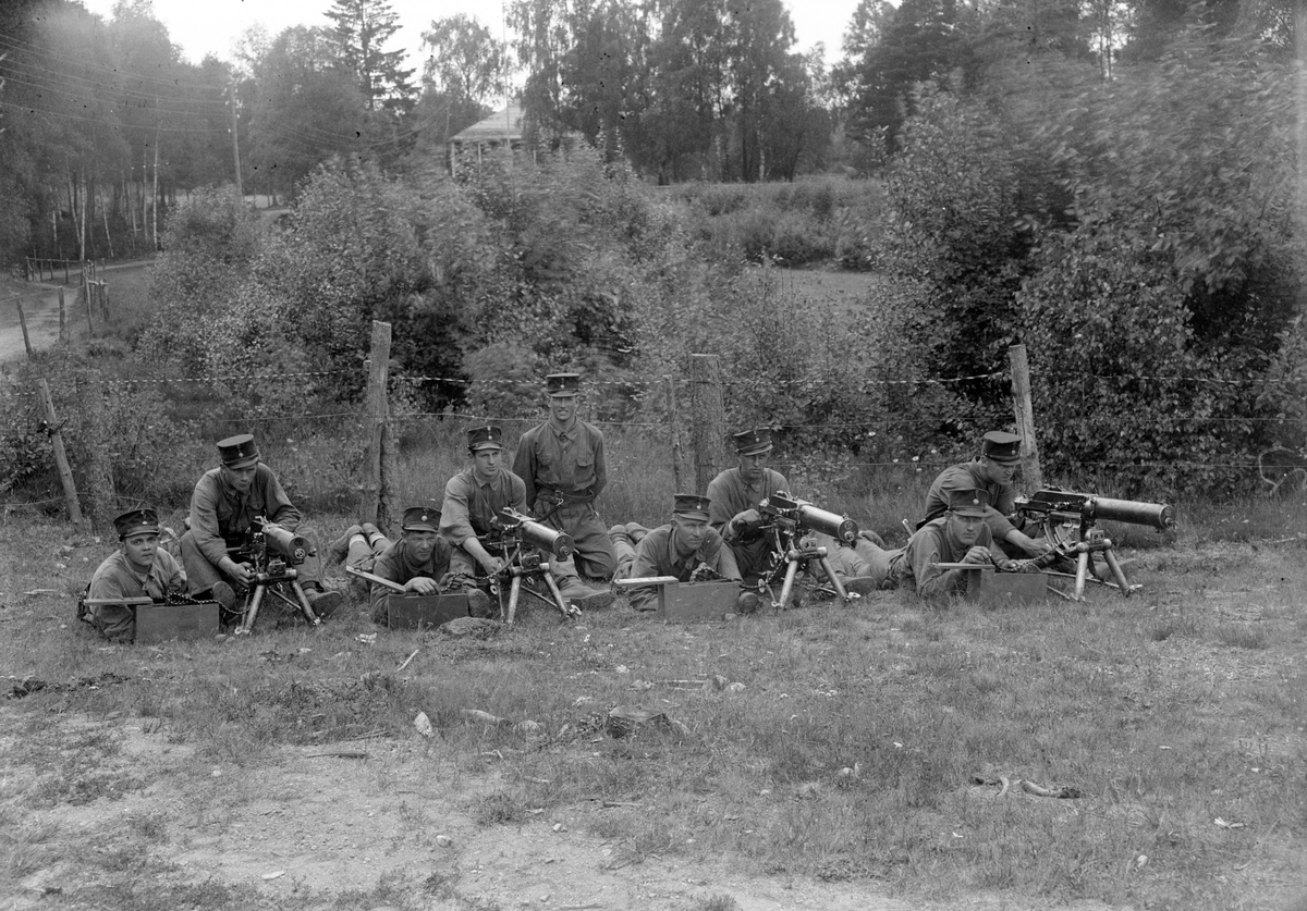 Foto av en grupp meniga som övar kulspruteskytte. I bakgrunden skymtar en stig och ett mindre hus.