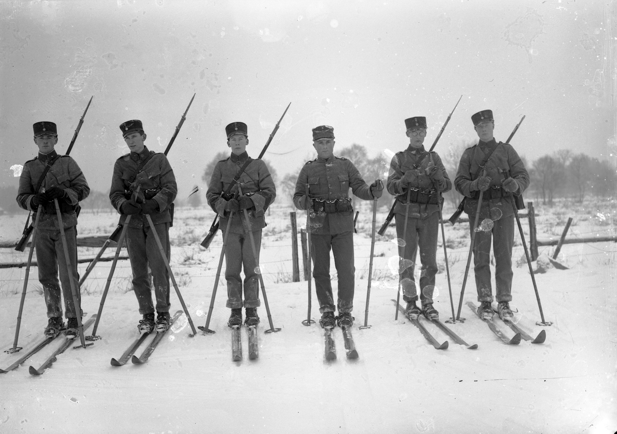 Foto av en grupp meniga i vinteruniform, på skidor.