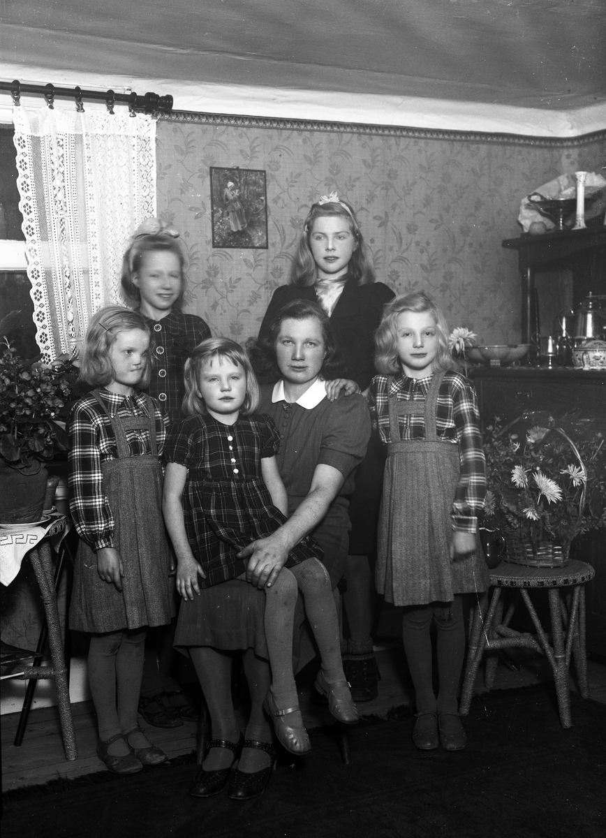 Foto av en mor med fem barn (flickor) i ett vardagsrum.