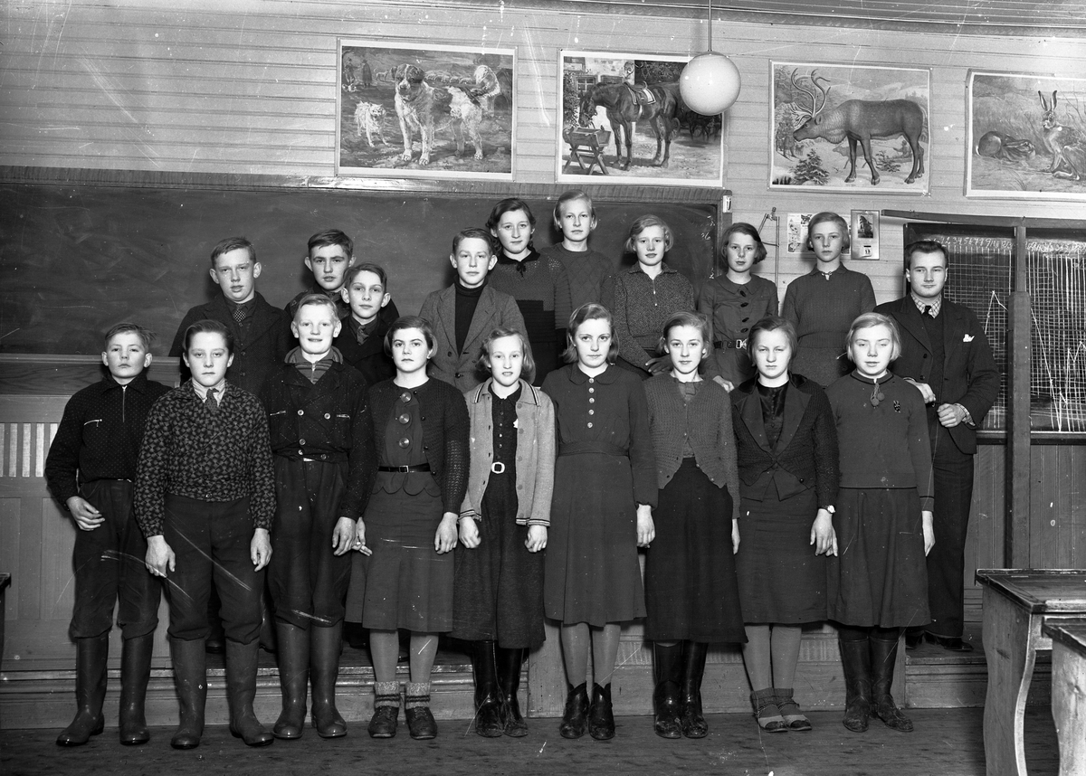 Foto av en skolklass med magister, i en skolsal.