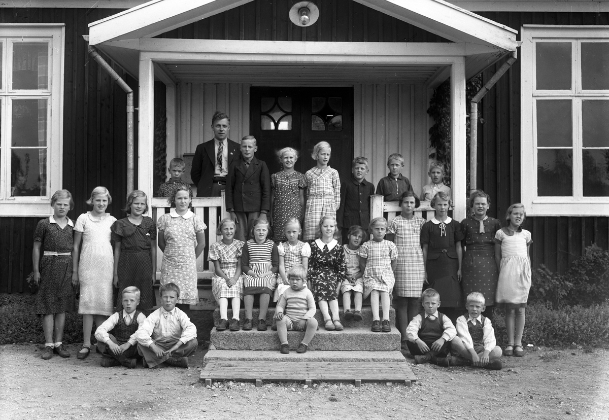 Foto av en skolklass med lärare, som samlats på skolans veranda.