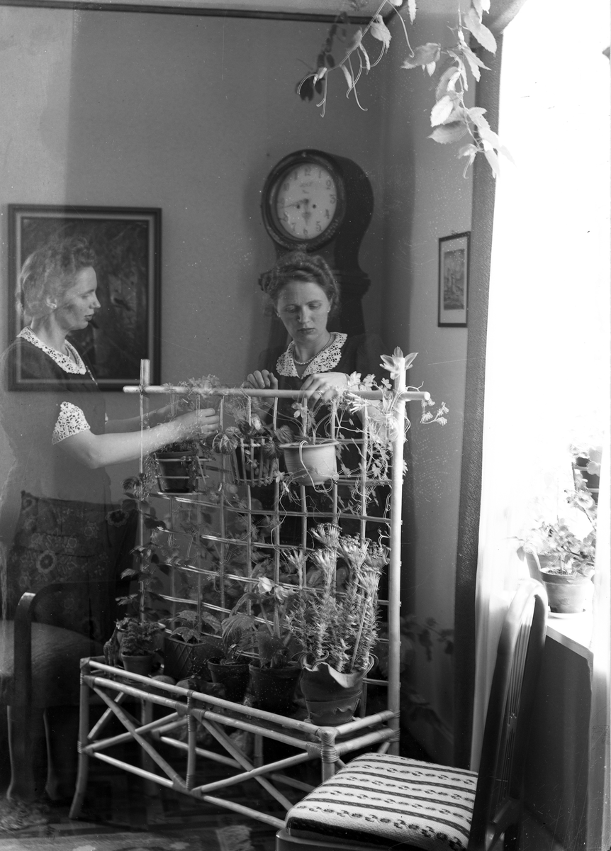 Foto av två kvinnor vid en spaljé i ett vardagsrum.