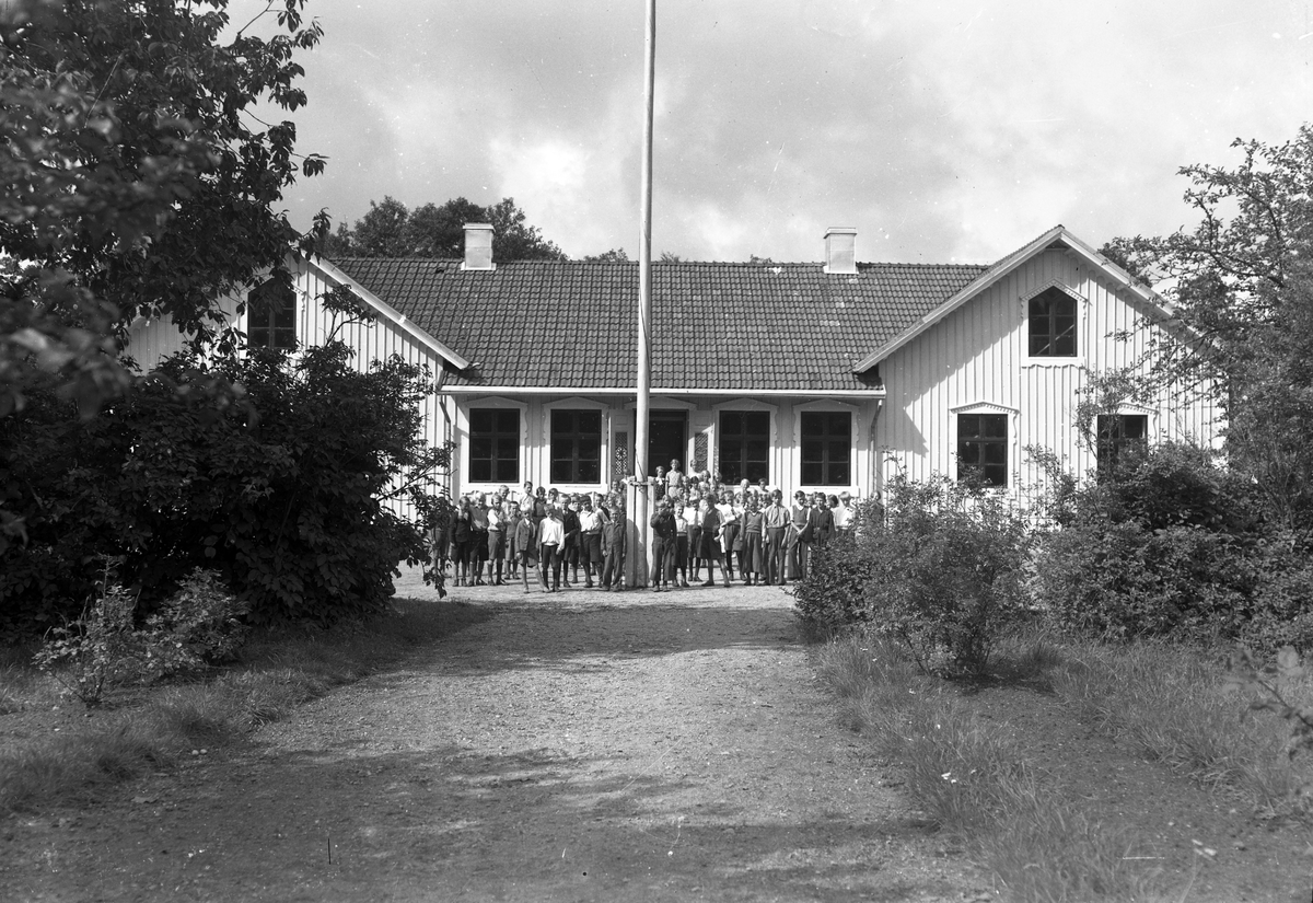 Foto av en skolklass med lärare, som samlats utanför skolan.