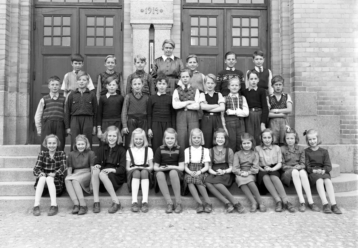 Foto av en skolklass med lärarinna, som samlats utanför skolans port.