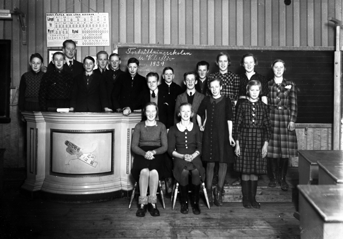 Foto av en skolklass med lärare, som samlats i ett klassrum.
