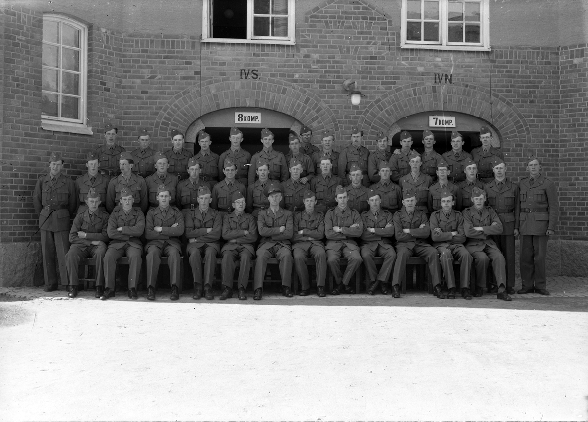Titel: Gruppfoto (pluton) utanför kasern. I 11, Växjö