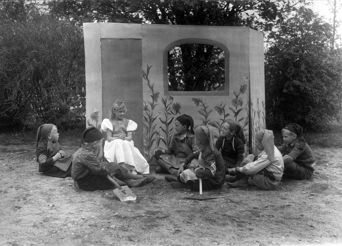Foto av skolteater utomhus - Snövit och de sju dvärgarna.