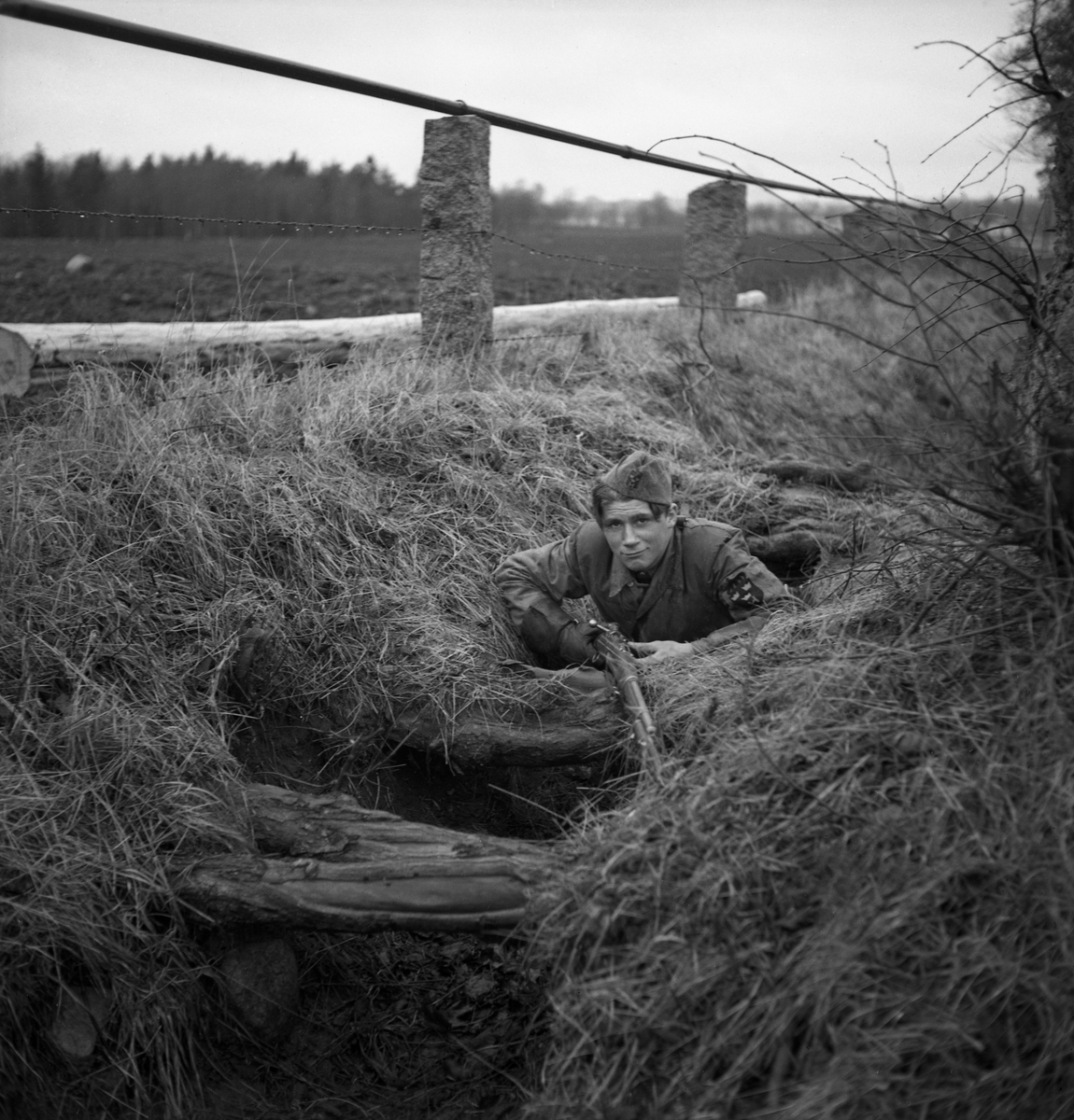 En tonårspojke i hemvärnsuniform ligger på pass i ett dike, bredvid