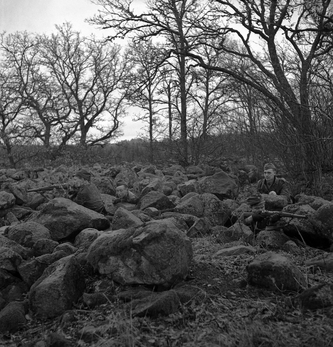 Några män i hermvärnsuniform på pass i ett stenröse.
