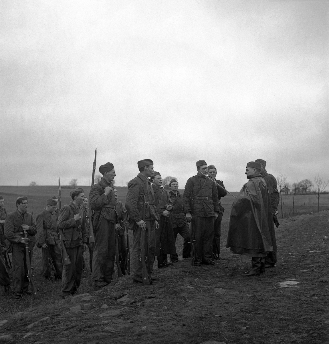Några män i hermvärnsuniform har genomgång på ett gärde.