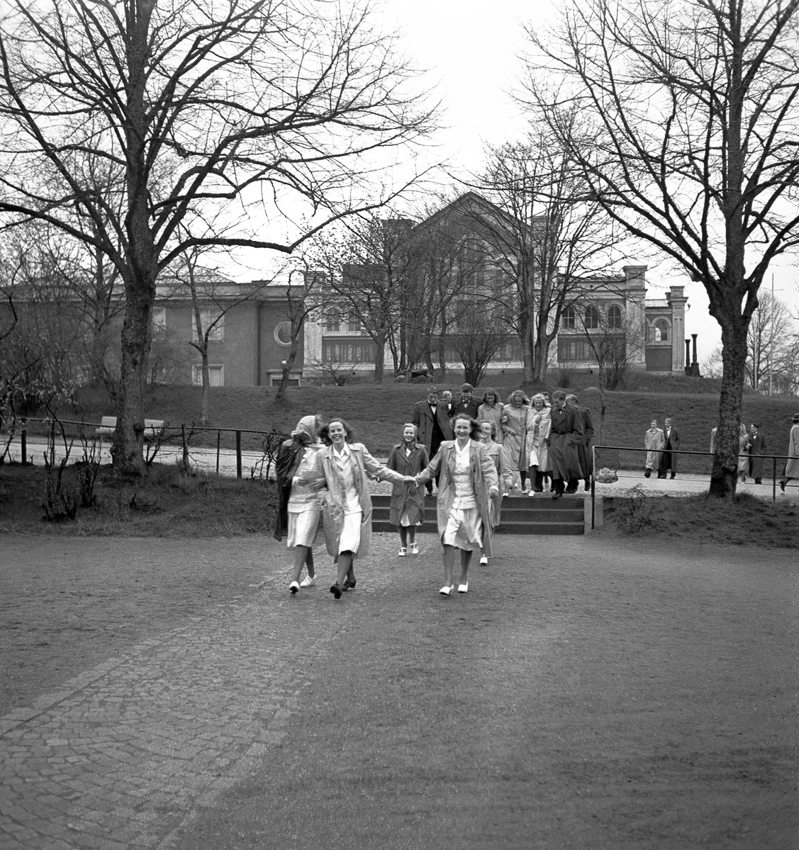 Elever på väg in på läroverkets skolgård, troligen strax innan utspark.