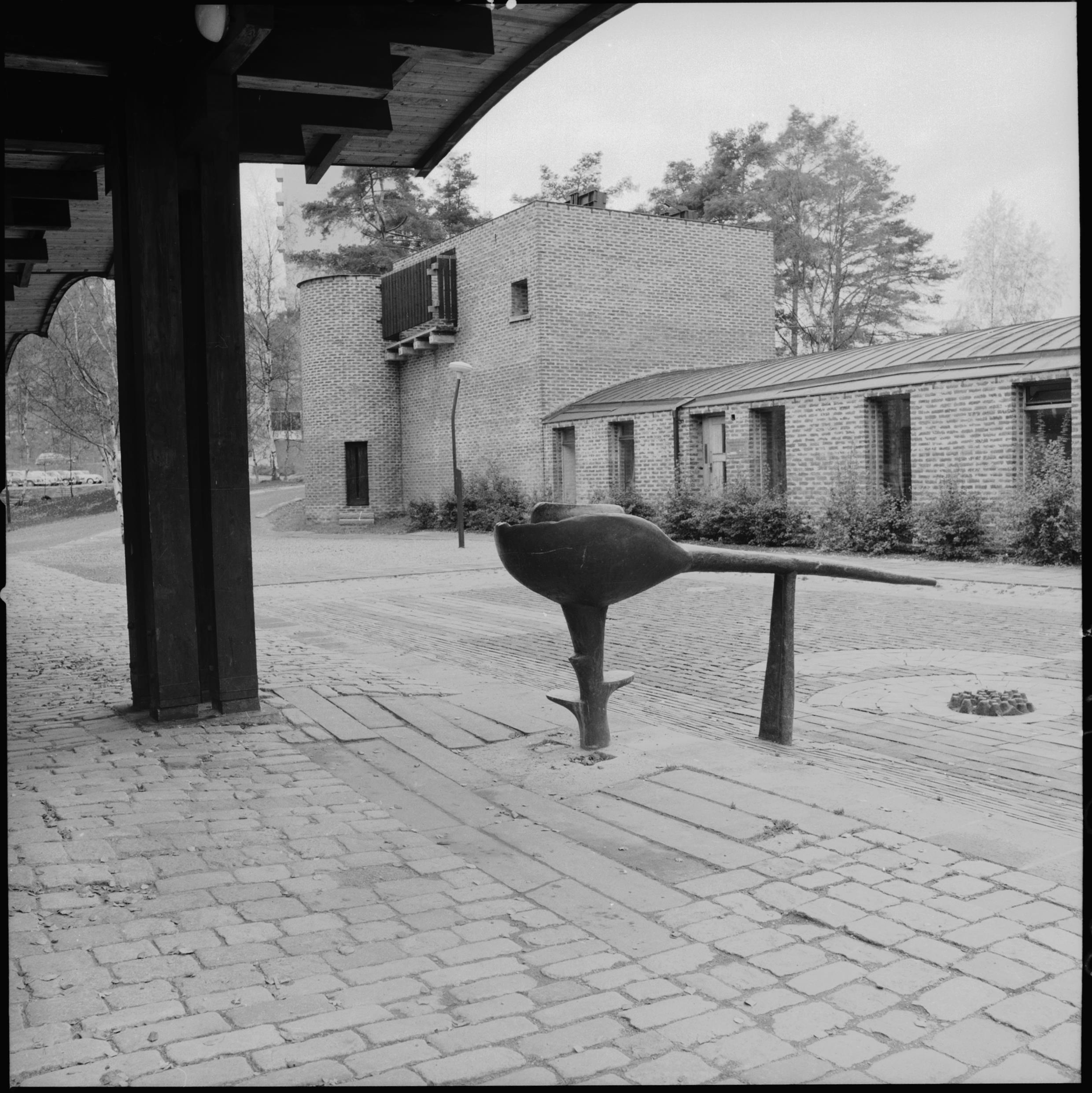 Skulptur vid Spegeldammen, sedd från kyrkans västra sida, i bakgrunden kanslibyggnaden.