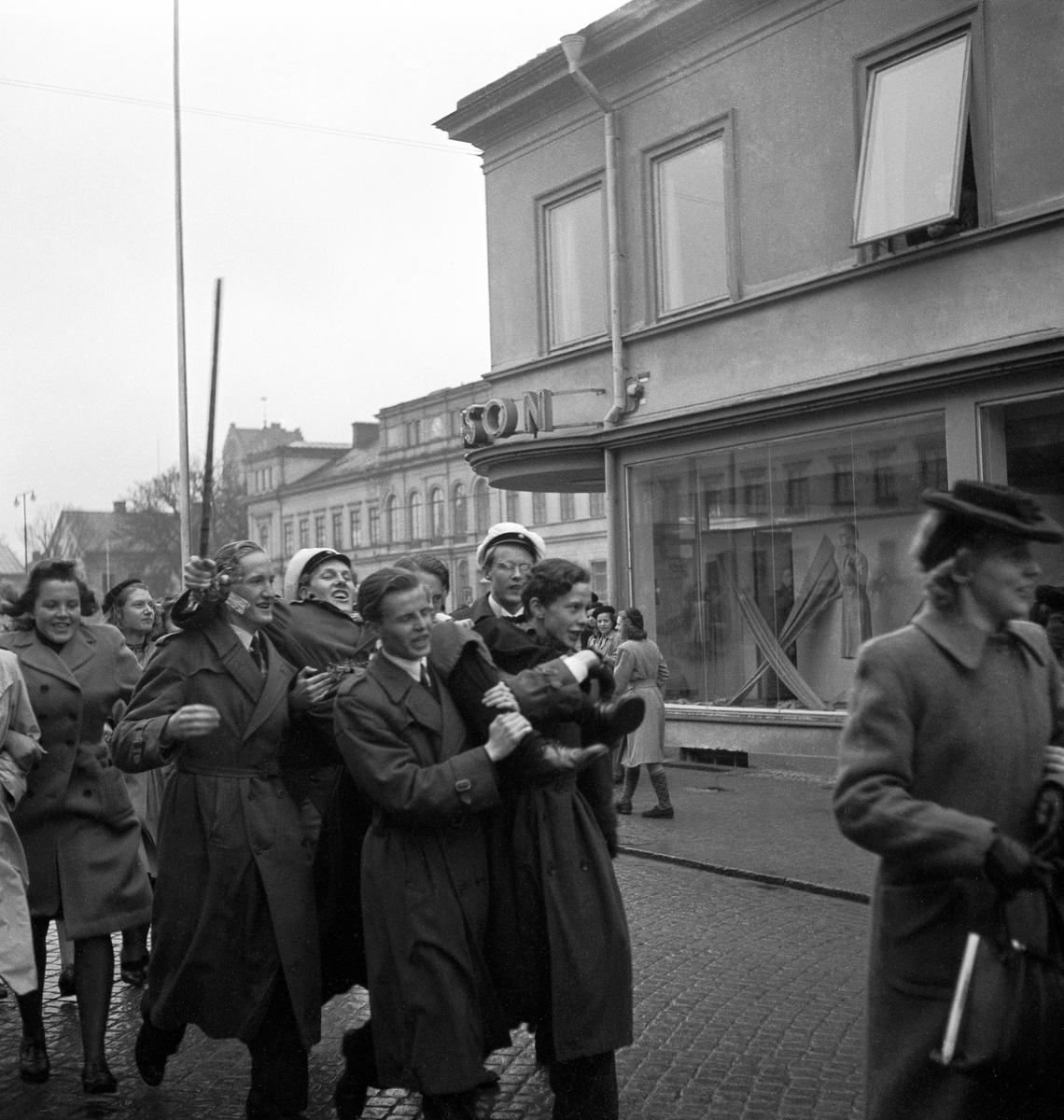 En student bärs iväg längs Storgatan, från Stortorget. Till höger syns dåv. P.N. Perssons hörna, och i bakgrunden skymtar Stadshotellet.