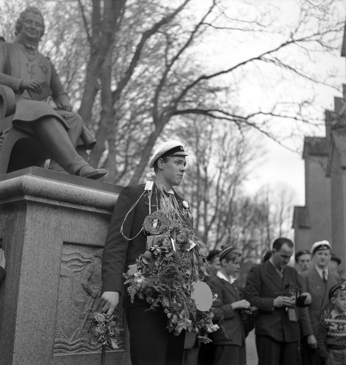 En student vid foten av Esaias Tegnérs staty, utanför domkyrkan.