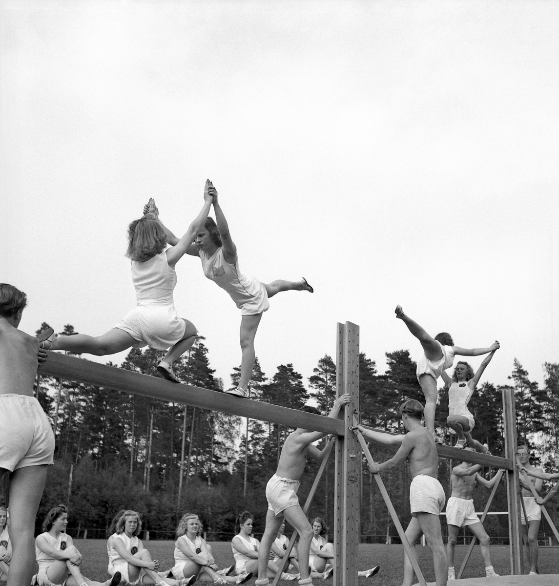 Gymnastikuppvisning på bommar av kvinnliga gymnaster, med