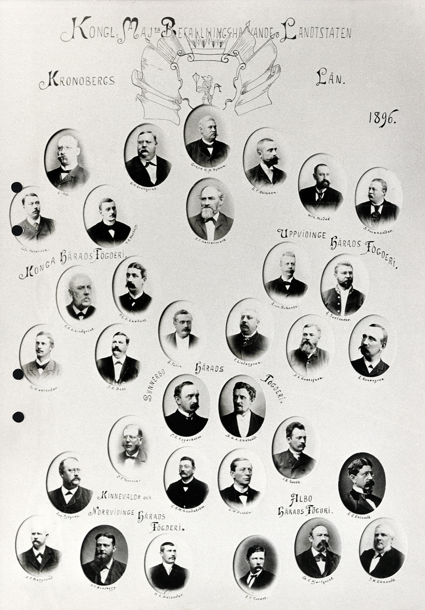 Överst ser man dåv. landshövdingen, greve G.H. Spens, med tjänstemännen i dåv. landskontoret m.m. på båda sidor. En bit ner t. vänster: Konga Härads Fögderi, t. höger Uppvidinge Härads Fögderi, i mitten Sunnerbo Härads Fögderi. Nederst t. vänster: Kinnevalds och Norrvidinge Härads Fögderi och t. höger Albo (Allbo) Härads Fögderi.