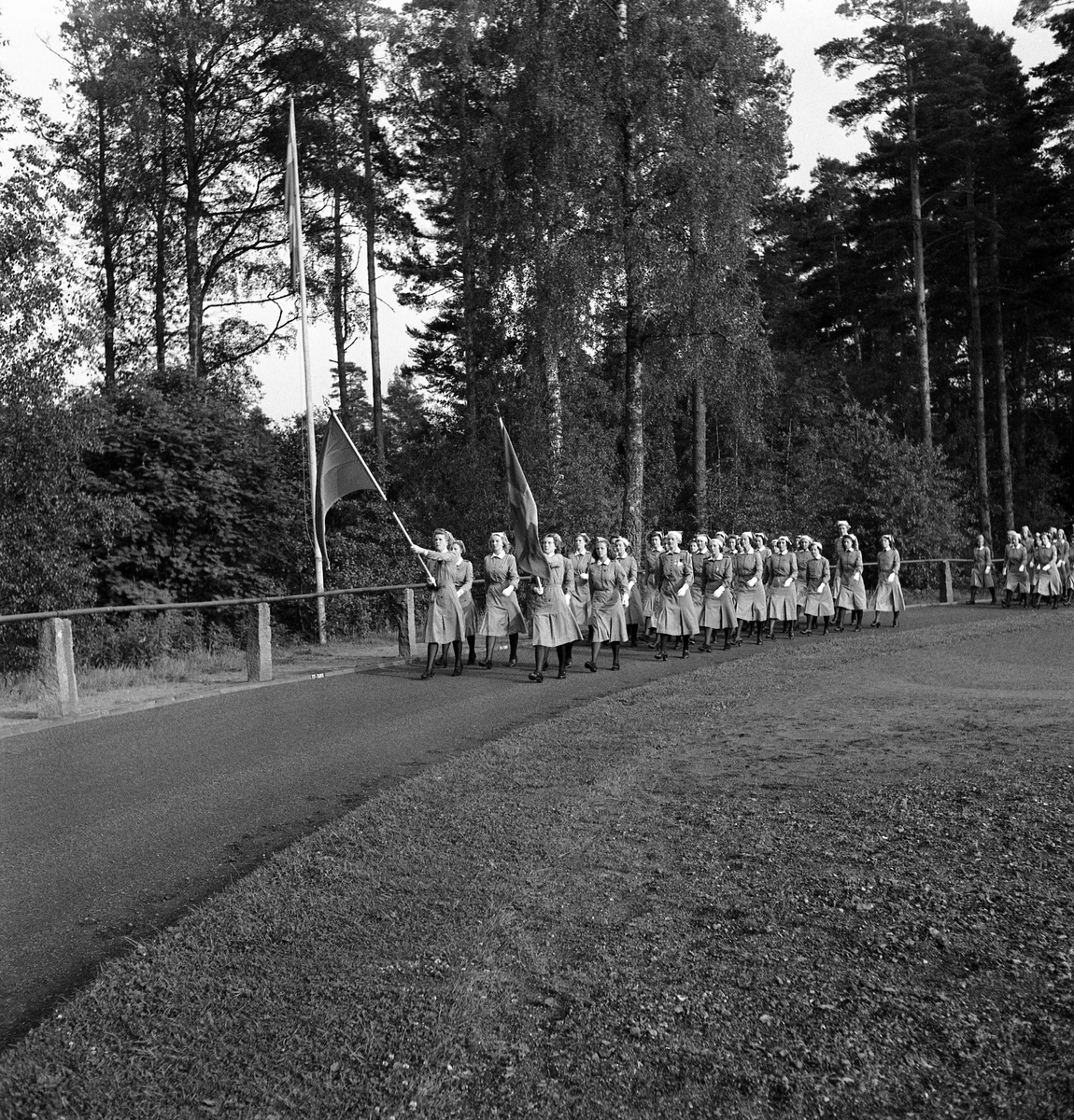 Ett antal kvinnor med svenska flaggor tågar in på Värendsvallen.