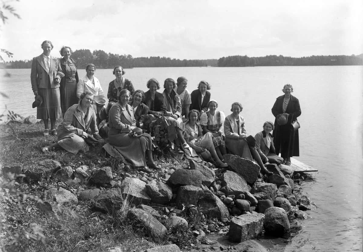 Foto av ett antal damer på utflykt. De har slagit sig ner vid en stenig sjöstrand i närheten av Bergsnäs.