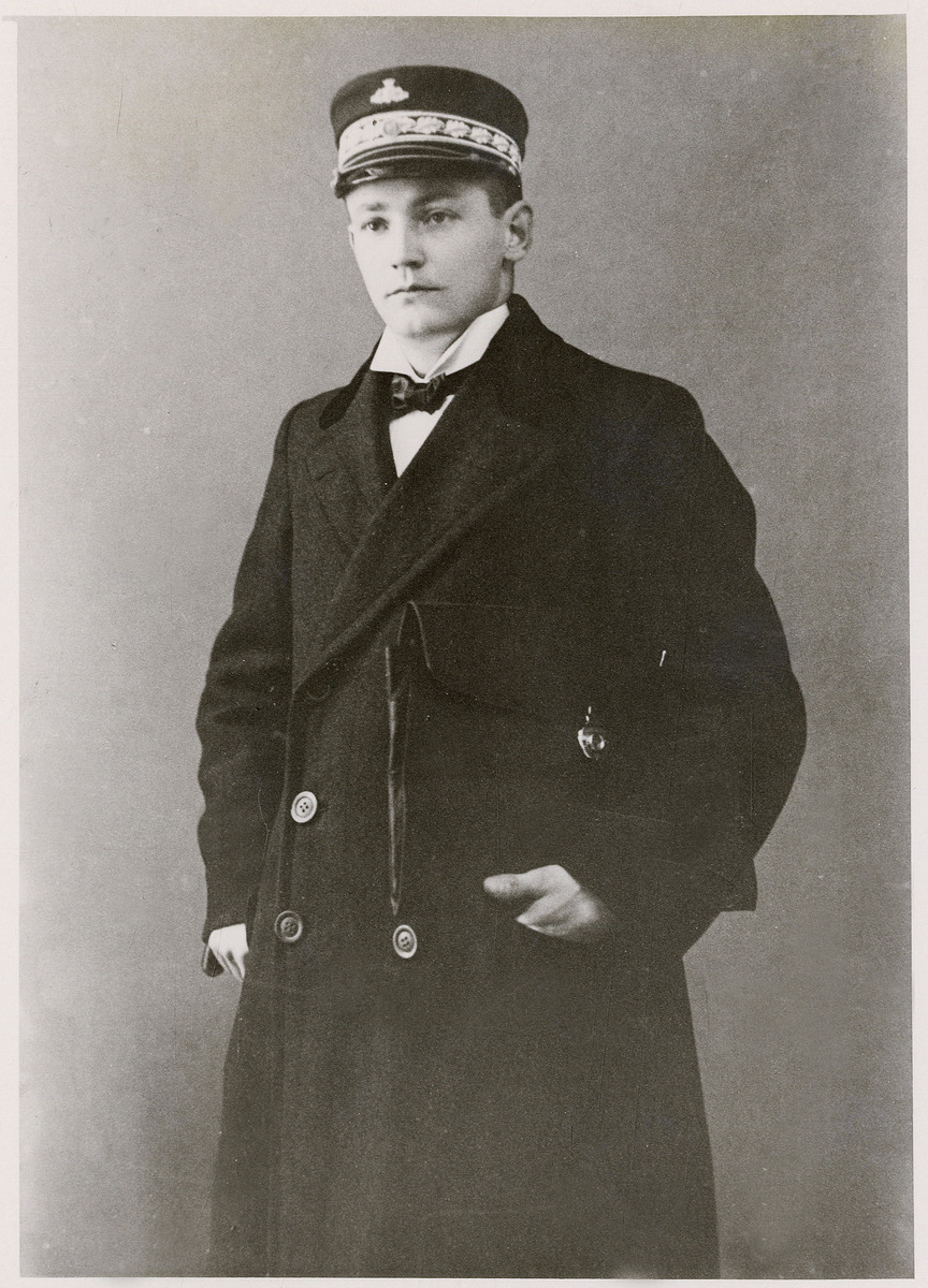 Nyblivne kronolänsmannen Ernst Bjersing, ca 1917, i länsmansuniform med rock och skärmmössa och med en portfölj under armen.