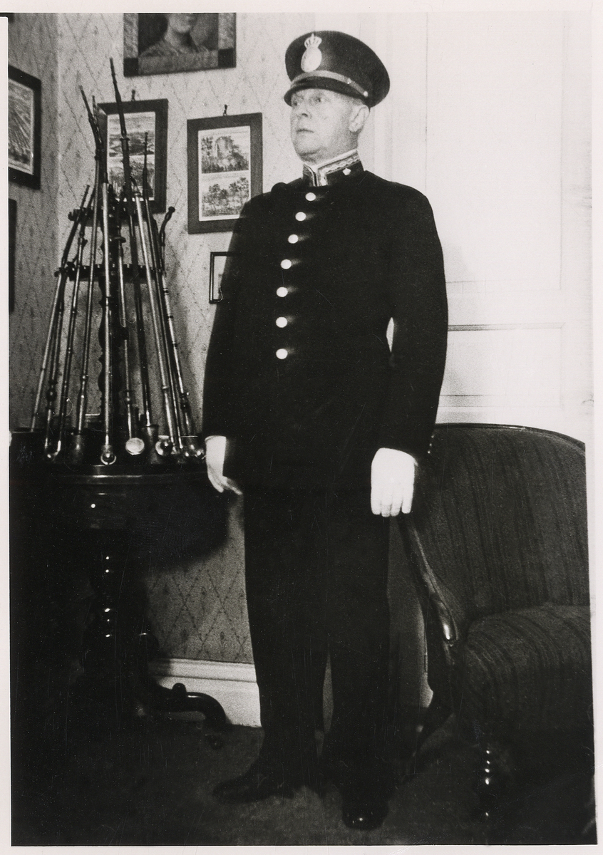 Landsfiskal Axel Lönegren, Växjö, står uppsträckt i full landsfiskalsuniform i ett s.k. herrum. Till vänster syns ett stort pipställ.