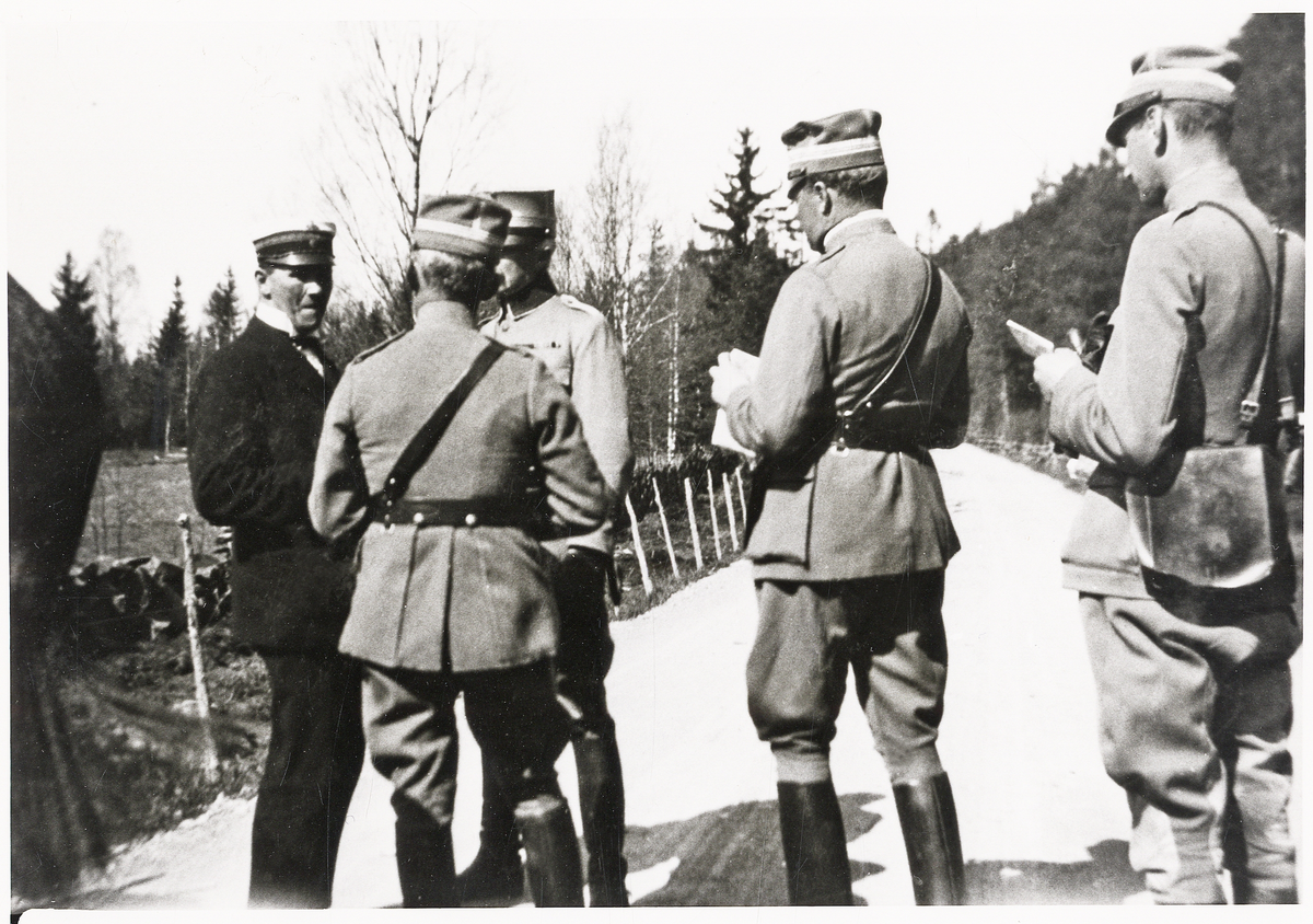 Poliskonstapel Per Ohlsson, Alvesta, i samspråk med några militärer under en militärmanöver i Alvestatrakten, ca 1920-25.