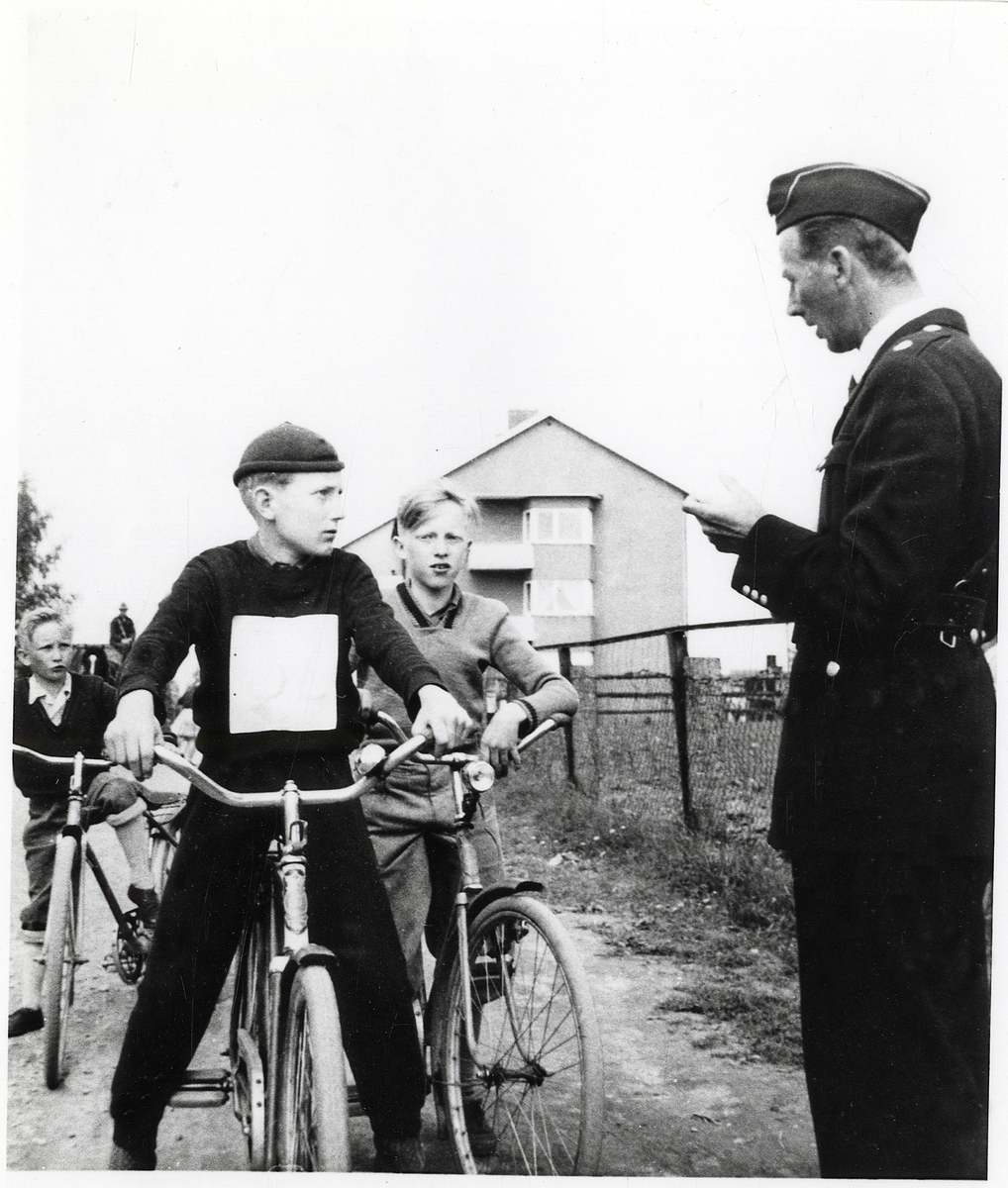 Poliskonstapel Lennart Baugert har trafikundervisning med några skolpojkar. Alvesta 1956.