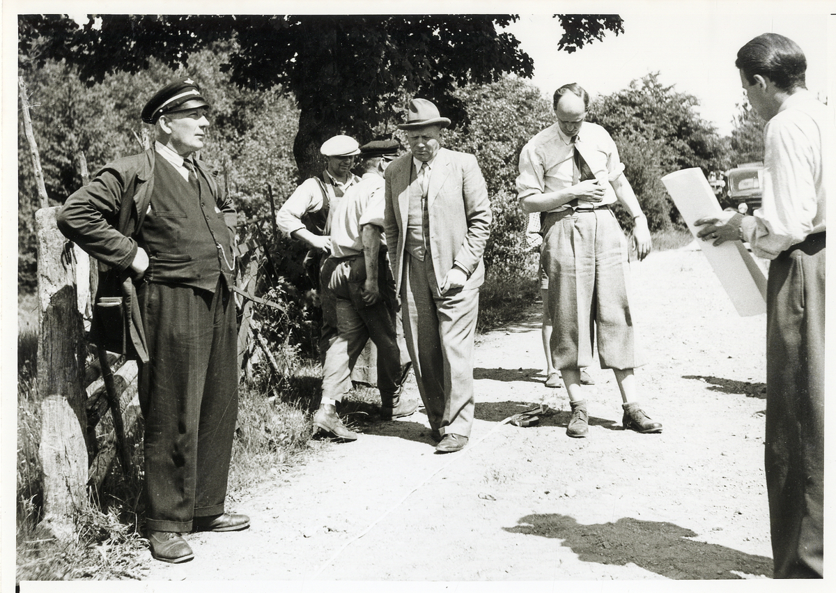 Överkonstapel Gösta W Axelsson (i kostym och hatt) och konstapel Uno Logarn (i golfbyxor) vid en syning längs en grusväg, 1949.