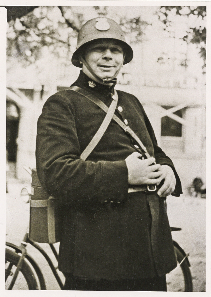 Konstapel Axel Nordström som civilförsvarspolis under en övning, 1941.