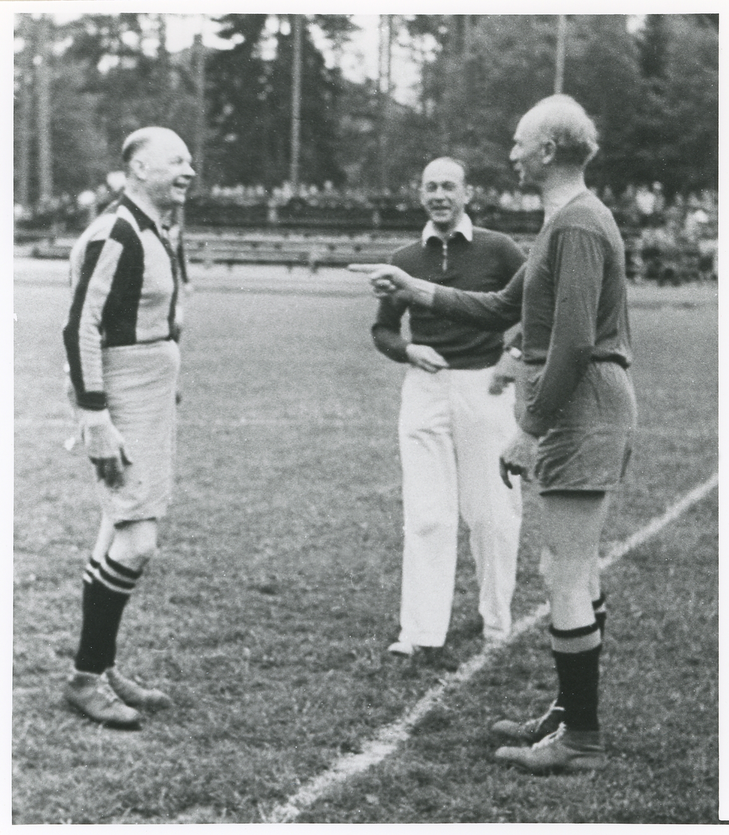 Överkonstapel Manfred Lundin och kommissarie Swanström diskuterar något vid en s.k. "gubbamatch" på Värendsvallen,