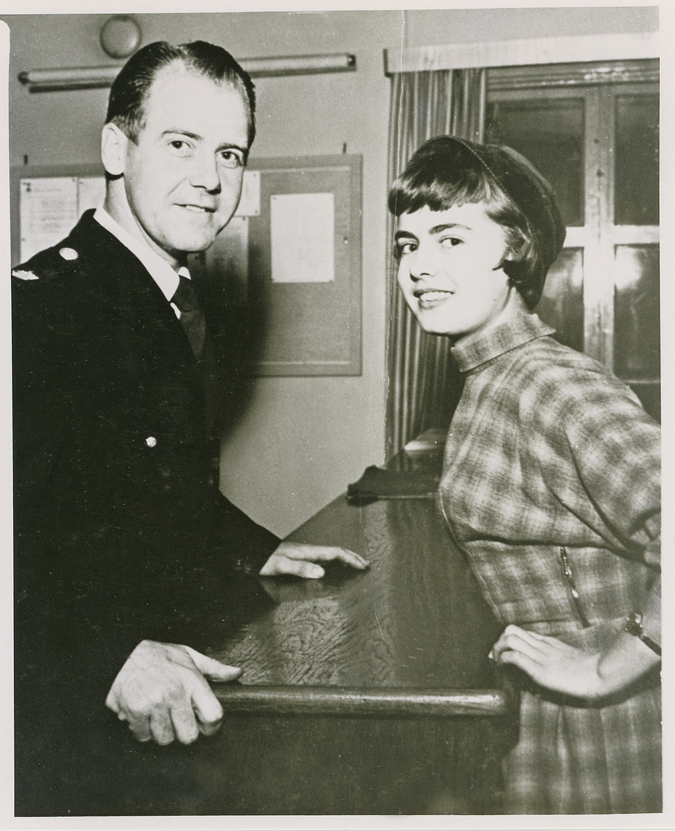 Poliskonstapel Erik Tegheim och Miss Pomona (Ann-Britt Wrele) på polisstationen Växjö,1953.