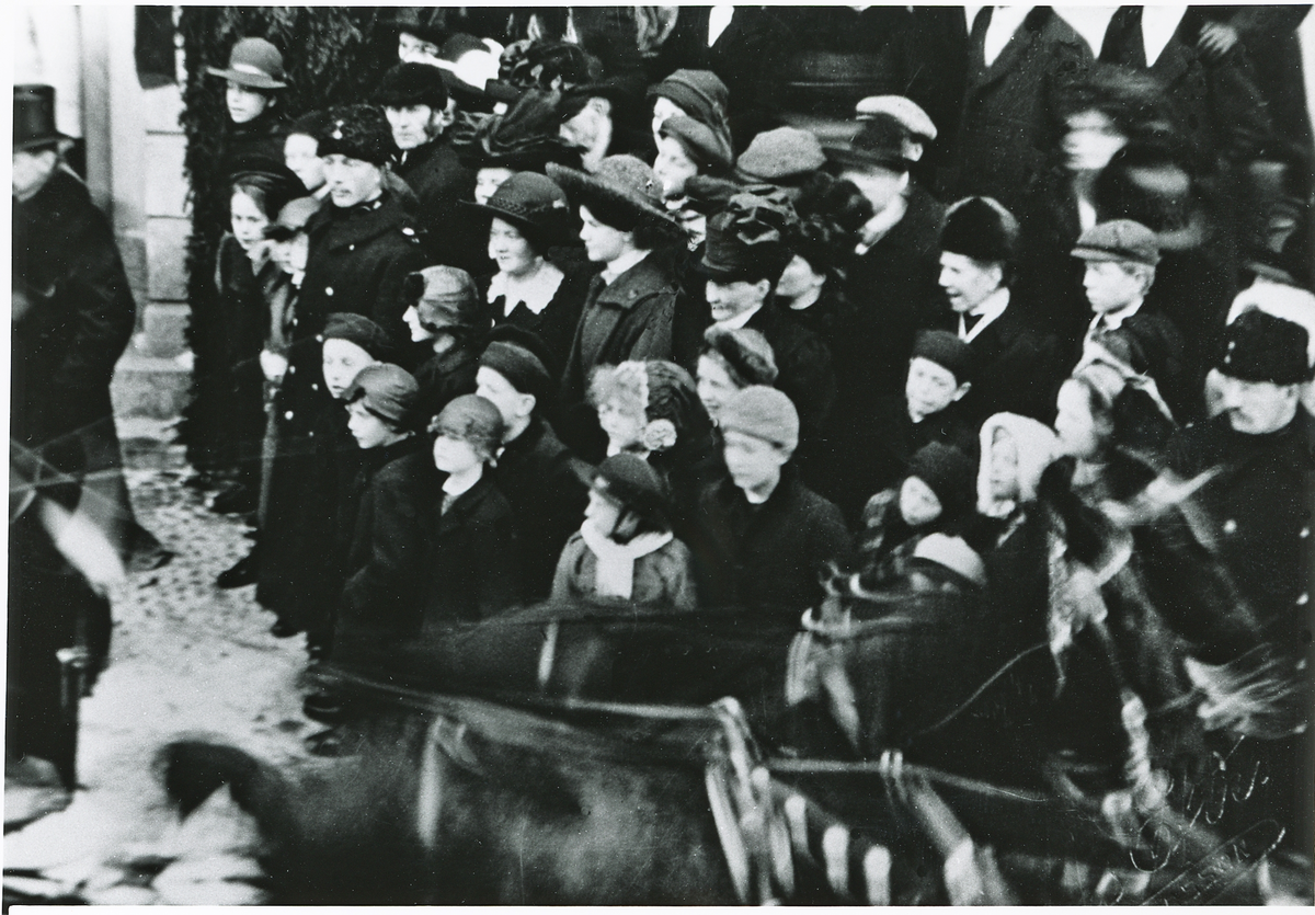 Stor folksamling, mestadels kvinnor och barn, vid järnvägsstationen. Poliskonstapel G.A. Petersson syns till vänster. Till höger skymtar en okänd polis.