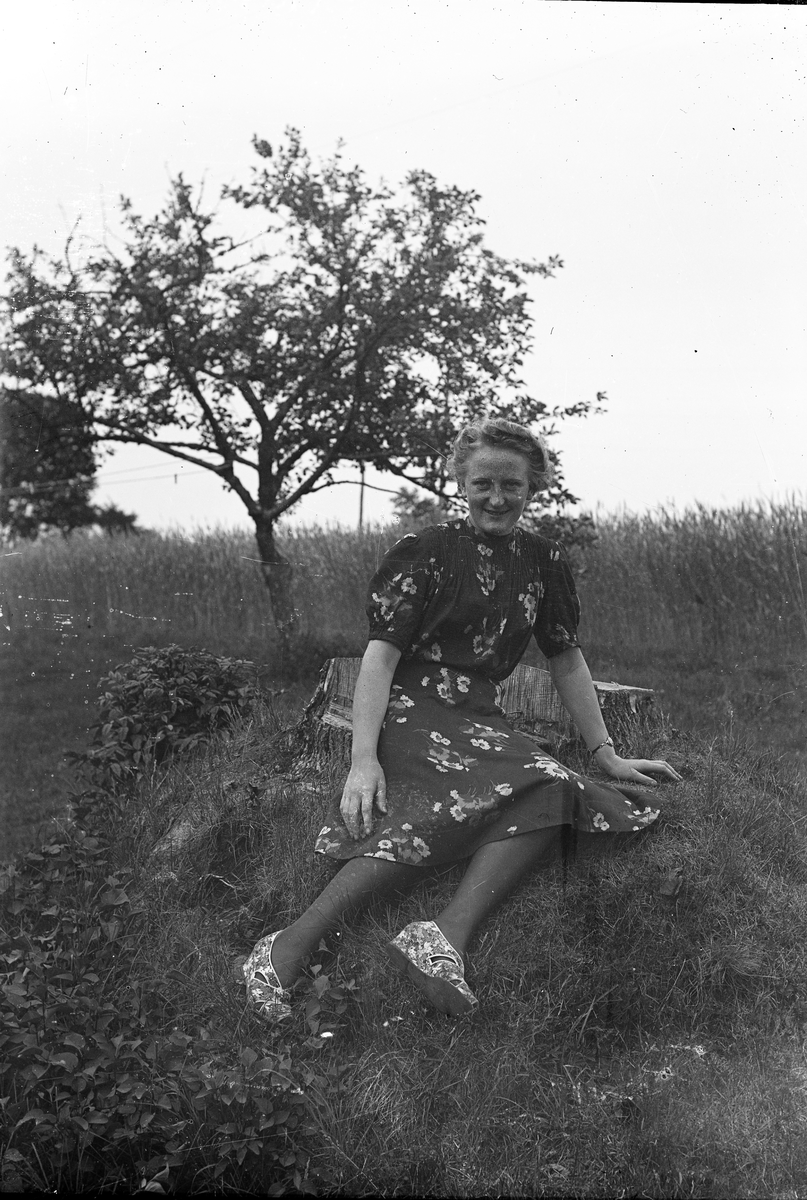 Foto av en kvinna i blommig klänning som sitter i en grässlänt.
