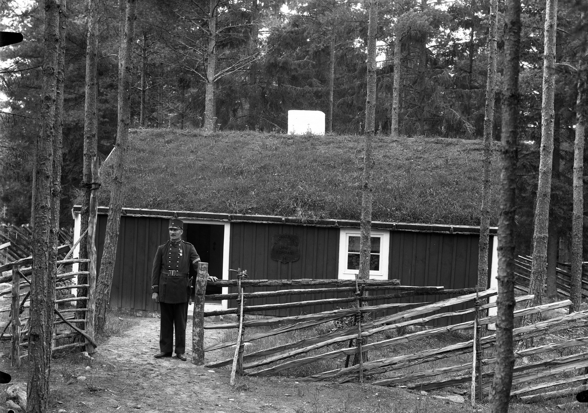 En äldre okänd man står klädd i uniform (m/ä) framför ett soldattorp.