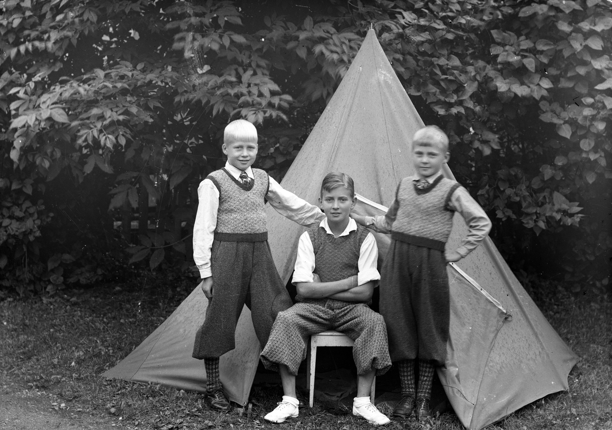 Tre okända pojkar i plusfourer ("äppelknyckarbyxor") m.m. framför ett indiantält.