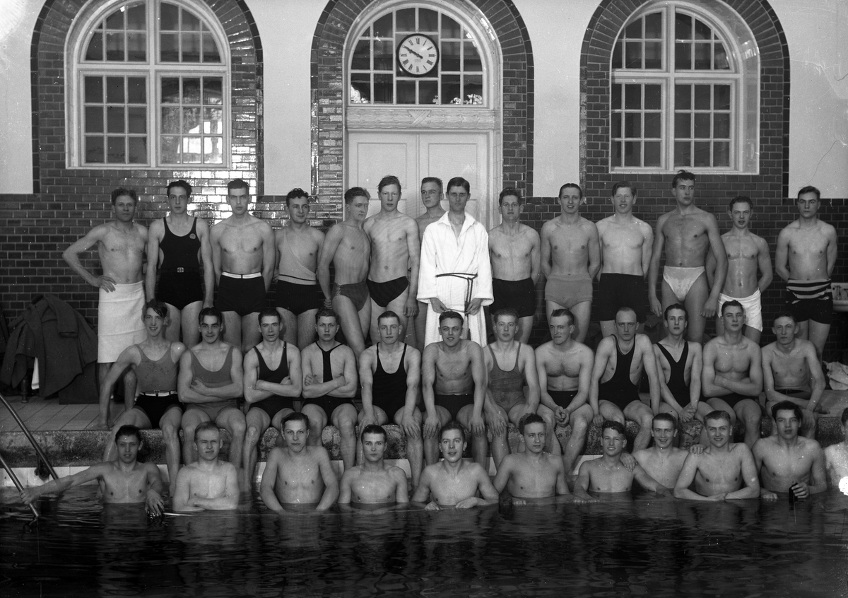 Växjö simsällskap har samlats för fotografering i badhuset, Växjö.