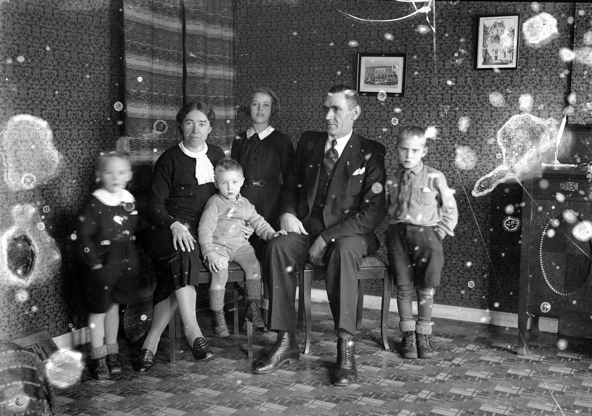 Foto av en familj med två små pojkar och en flicka. De är samlade i ett vardagsrum.