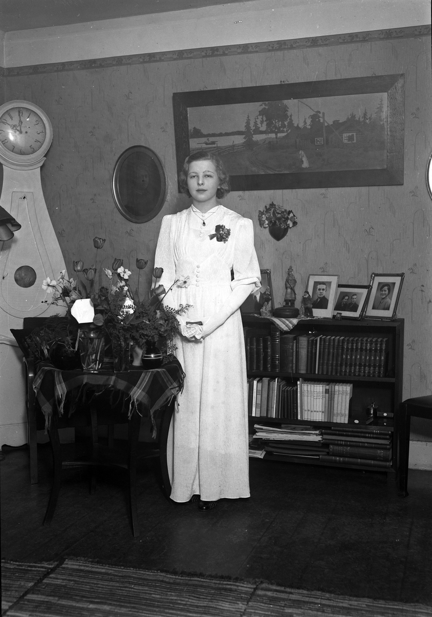 Foto av en kvinnlig konfirmand i lång vit konfirmationsklänning, stående i ett vardagsrum.