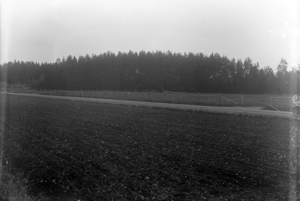 Åker (?) med landsväg. I bakgrunden syns granskog.