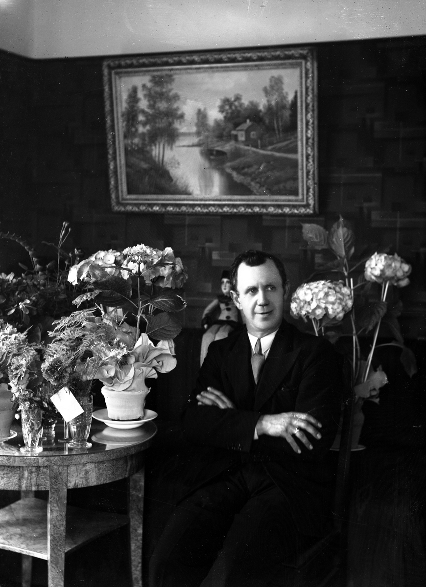 Foto av en man i kostym som sitter i ett vardagsrum med mängder av blommor runt sig.