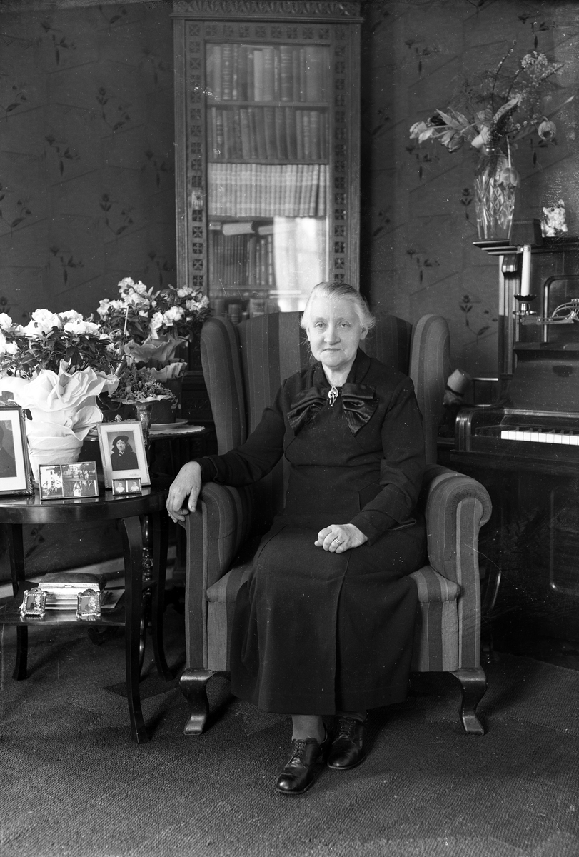 Foto av en äldre kvinna som sitter i en fåtölj i ett vardagsrum med blommor till vänster om sig.