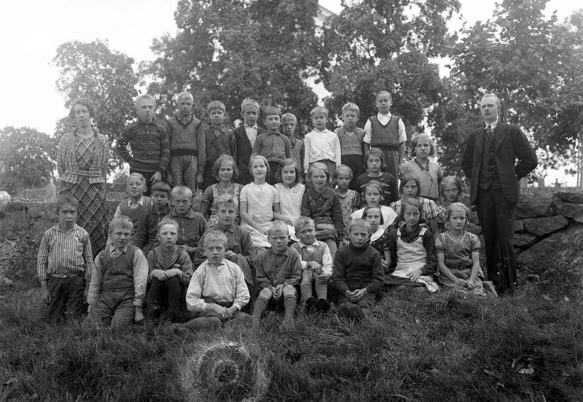 Foto av en skolklass med två lärare, som samlats utomhus.