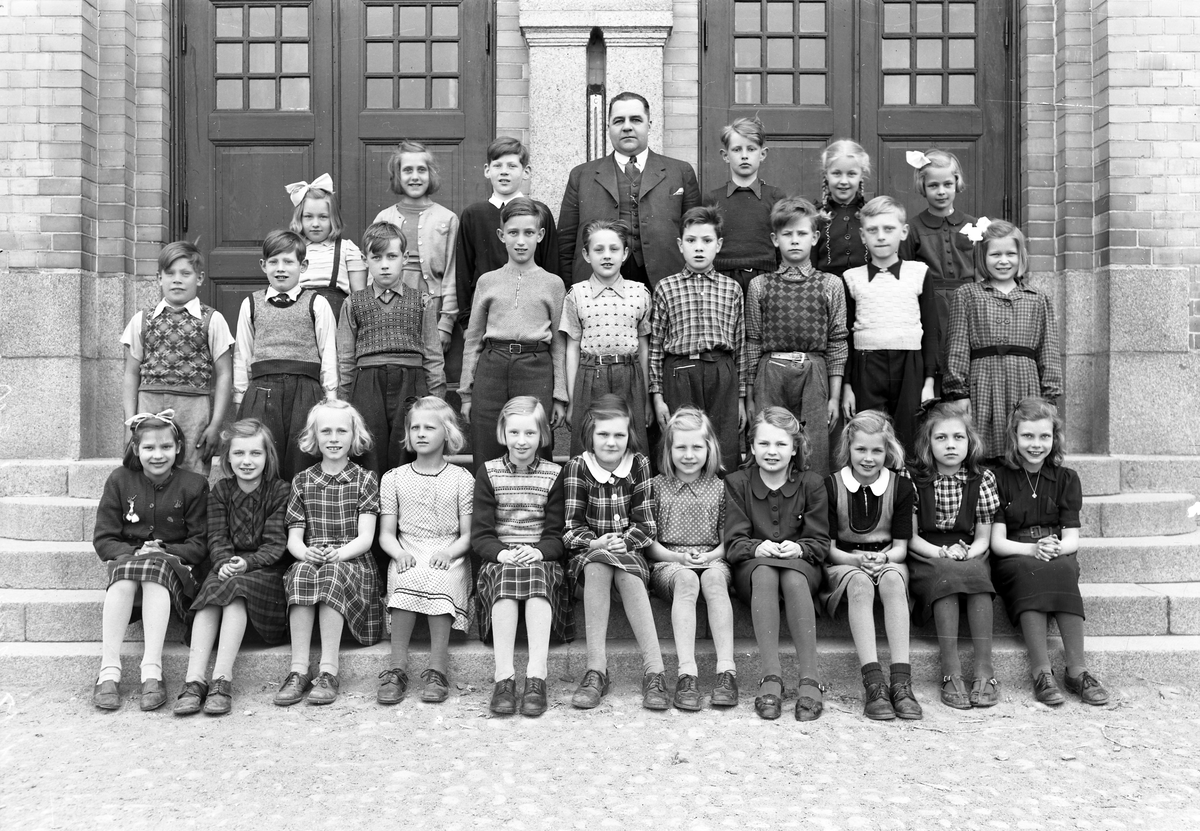 Titel: Foto av en skolklass med lärare, som samlats utanför skolans port.