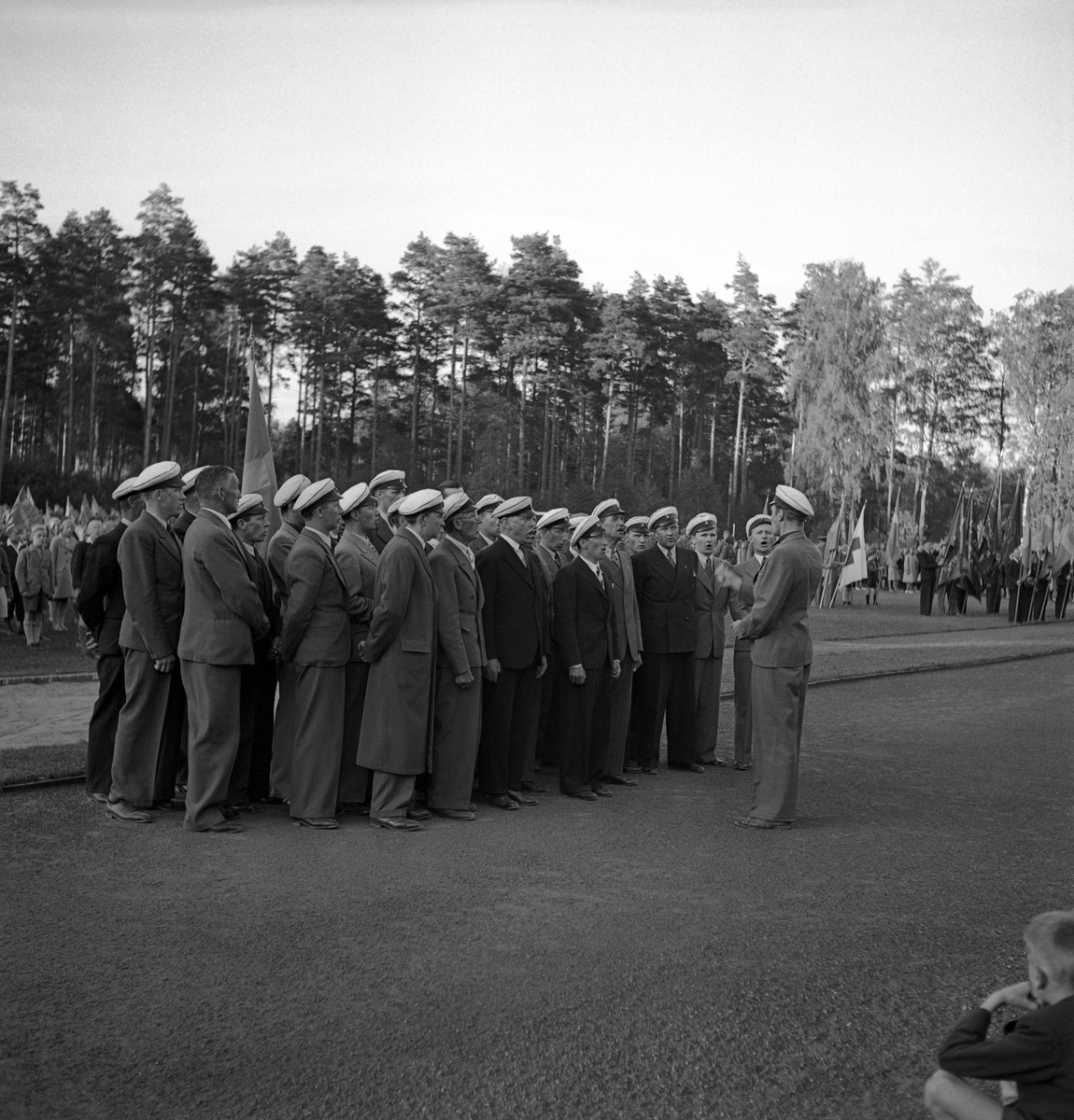 Svenska Flaggans dag, 6/6 1941. En manskör i s.k. sångarmössor sjunger på Värendsvallen.