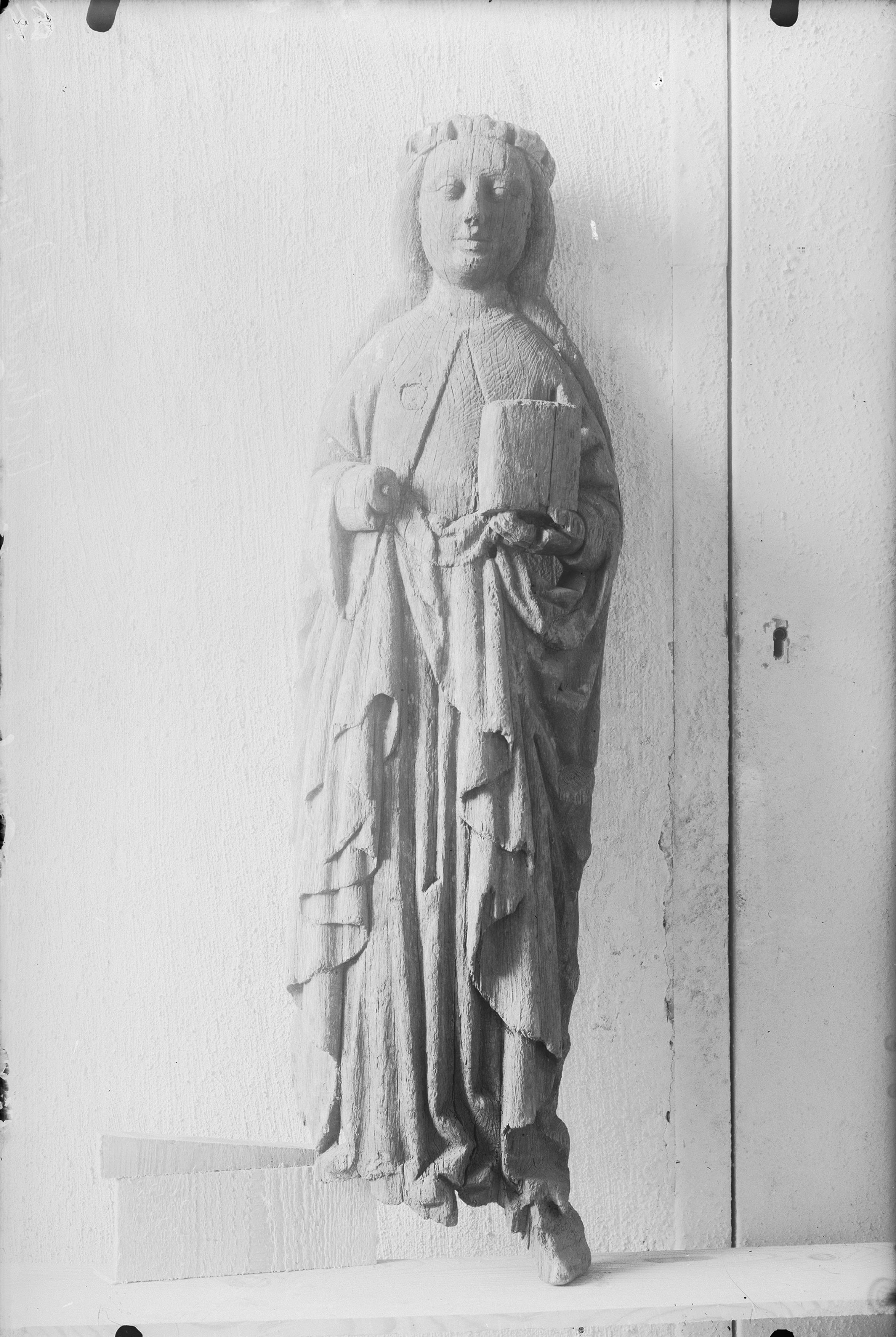 Skulptur, trä, kvinnligt helgon, stående, mitten av 1400-talet.