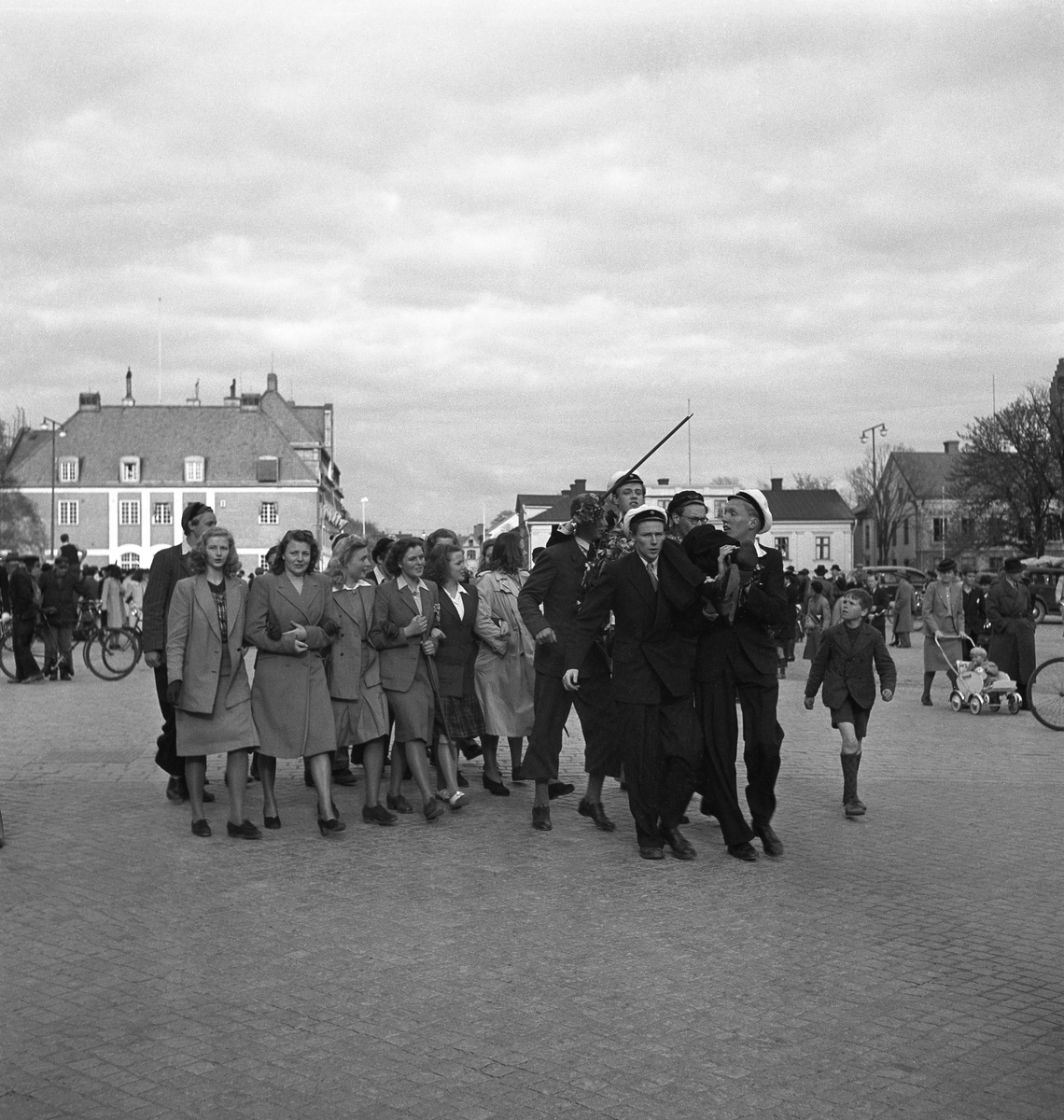En student bärs iväg längs Stortorget av sina kamrater. I bakgrunden syns