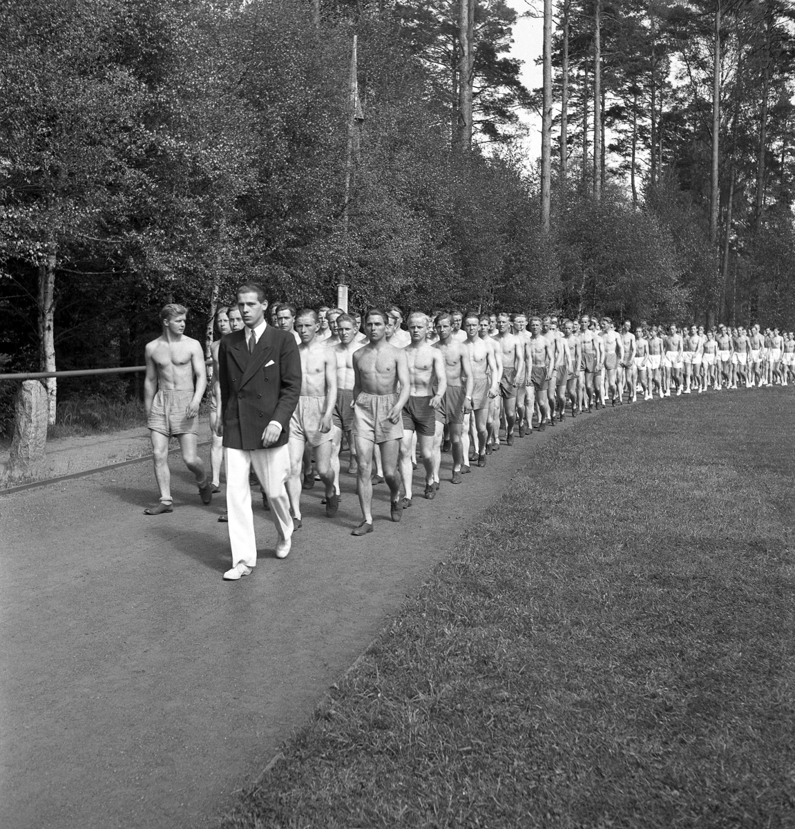 Inmarsch av manliga gymnaster på Värendsvallen.