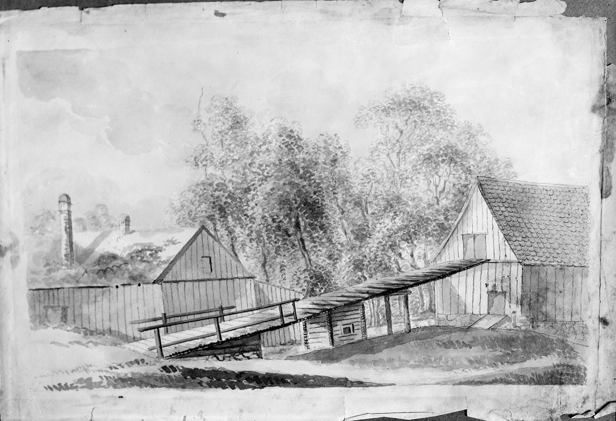 Tavla. Osignerad tuschlavyr på järnbruket Svanå Bruk. Tillhörde grosshandlare W. Lindeberg.